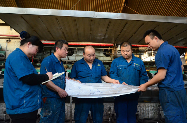 圖為家紡車間印花精益生產(chǎn)小組部分成員,在更換花色品種前討論分析質(zhì)量要點的情形。