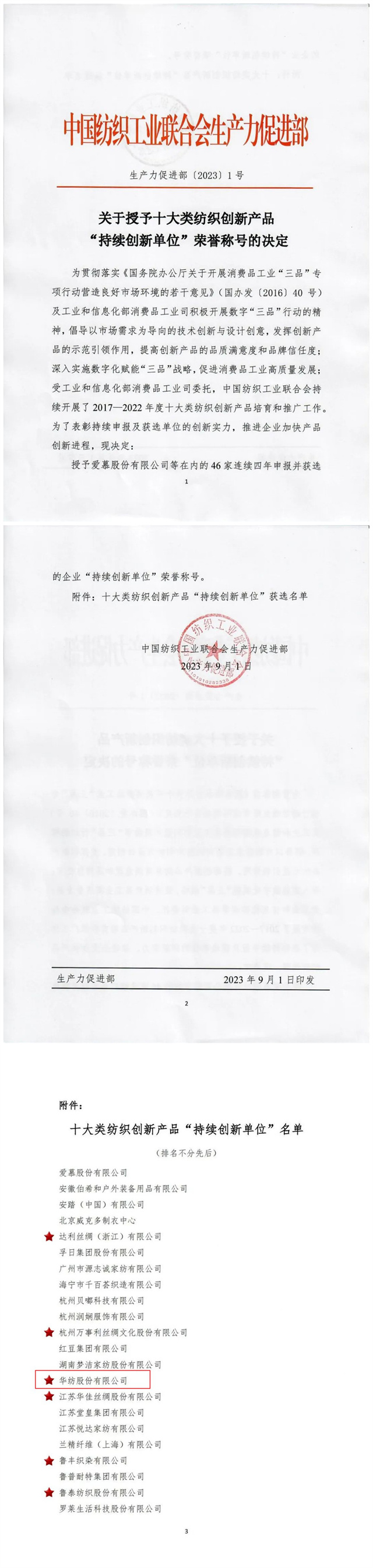 為表彰持續(xù)申報(bào)及獲選單位的創(chuàng)新實(shí)力,推進(jìn)企業(yè)加快產(chǎn)品創(chuàng)新進(jìn)程。近日,中國紡織工業(yè)聯(lián)合會(huì)生產(chǎn)力促進(jìn)部發(fā)布“關(guān)于十大類紡織創(chuàng)新產(chǎn)品‘持續(xù)創(chuàng)新單位’榮譽(yù)稱號(hào)的決定”,授予華紡股份有限公司等在內(nèi)的46家連續(xù)四年申報(bào)并獲選的企業(yè)“持續(xù)創(chuàng)新單位”榮譽(yù)稱號(hào)。