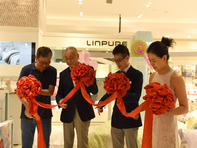 7月23日,華紡上海英儂公司Linpure藍(lán)鉑品牌成功入駐上海高級(jí)商場大丸百貨,華特迪士尼有限公司品牌高級(jí)經(jīng)理Zinia.Ling女士,上海大丸百貨店長原田隆晴先生、部長柴田真先生蒞臨現(xiàn)場參觀祝賀,并與華紡Linpure藍(lán)鉑品牌總經(jīng)理高鵬一同為開業(yè)剪彩。