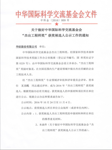 經“杰出工程師獎”專業(yè)領域評審組和評審委員會評審,華紡股份有限公司王力民同志通過評審,成為2016年“杰出工程師獎”獲獎候選人。根據獎勵辦法有關規(guī)定,獲獎候選人的申報材料需所在單位進行公示。公示如下:
