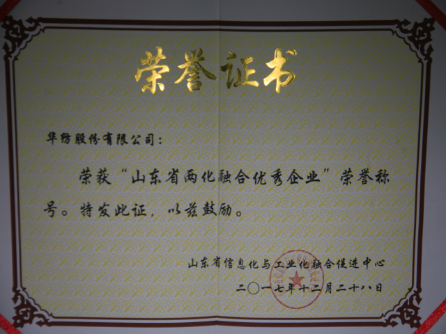 2017年12月28日,山東省信息化與工業(yè)化融合促進(jìn)中心公開表彰了“山東省兩化融合優(yōu)秀企業(yè)”,公司以近年來在兩化融合方面的卓越表現(xiàn),榮登這一榜單。